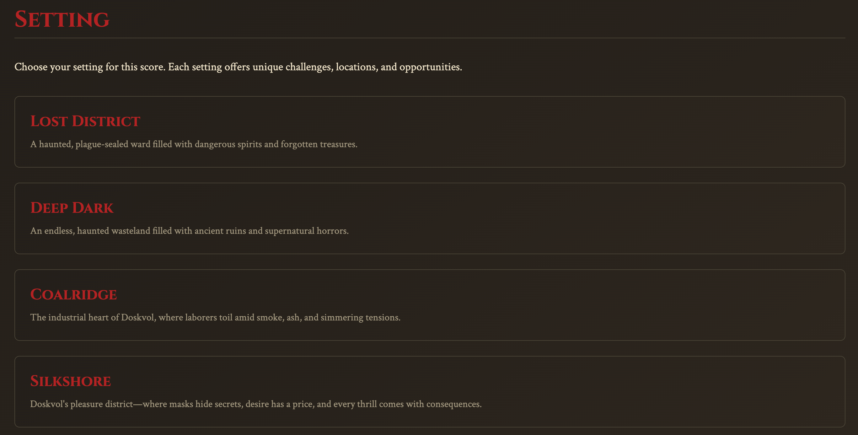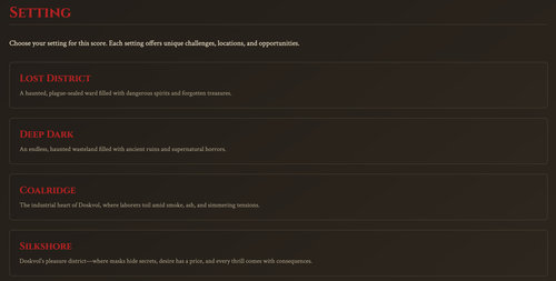 The Blades in the Dark Score Builder Web App just got a massive upgrade. What started as a single haunted ruin generator has grown into a full-fledged toolkit for building scores in many parts of Doskvol—or beyond the lightning barrier.